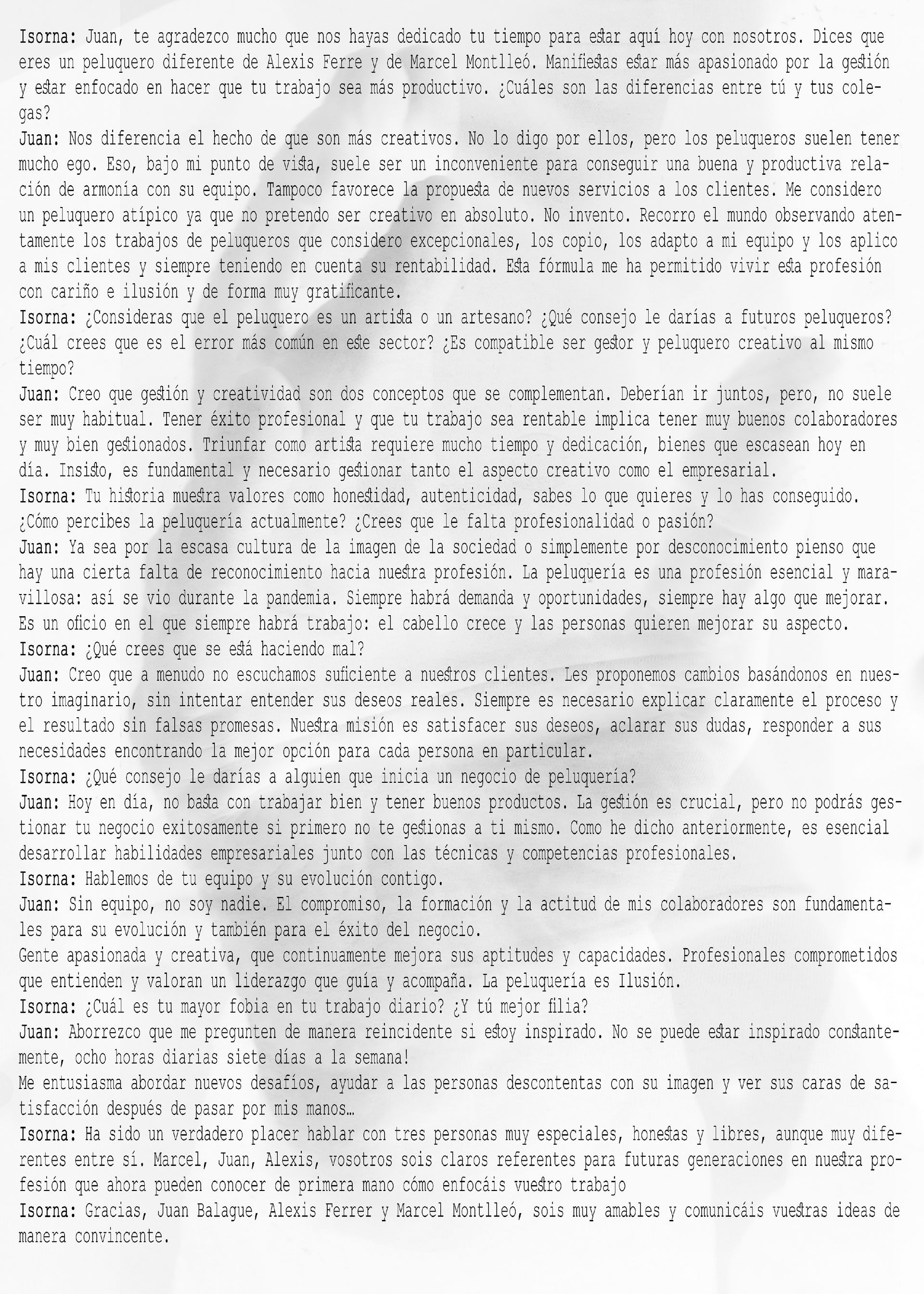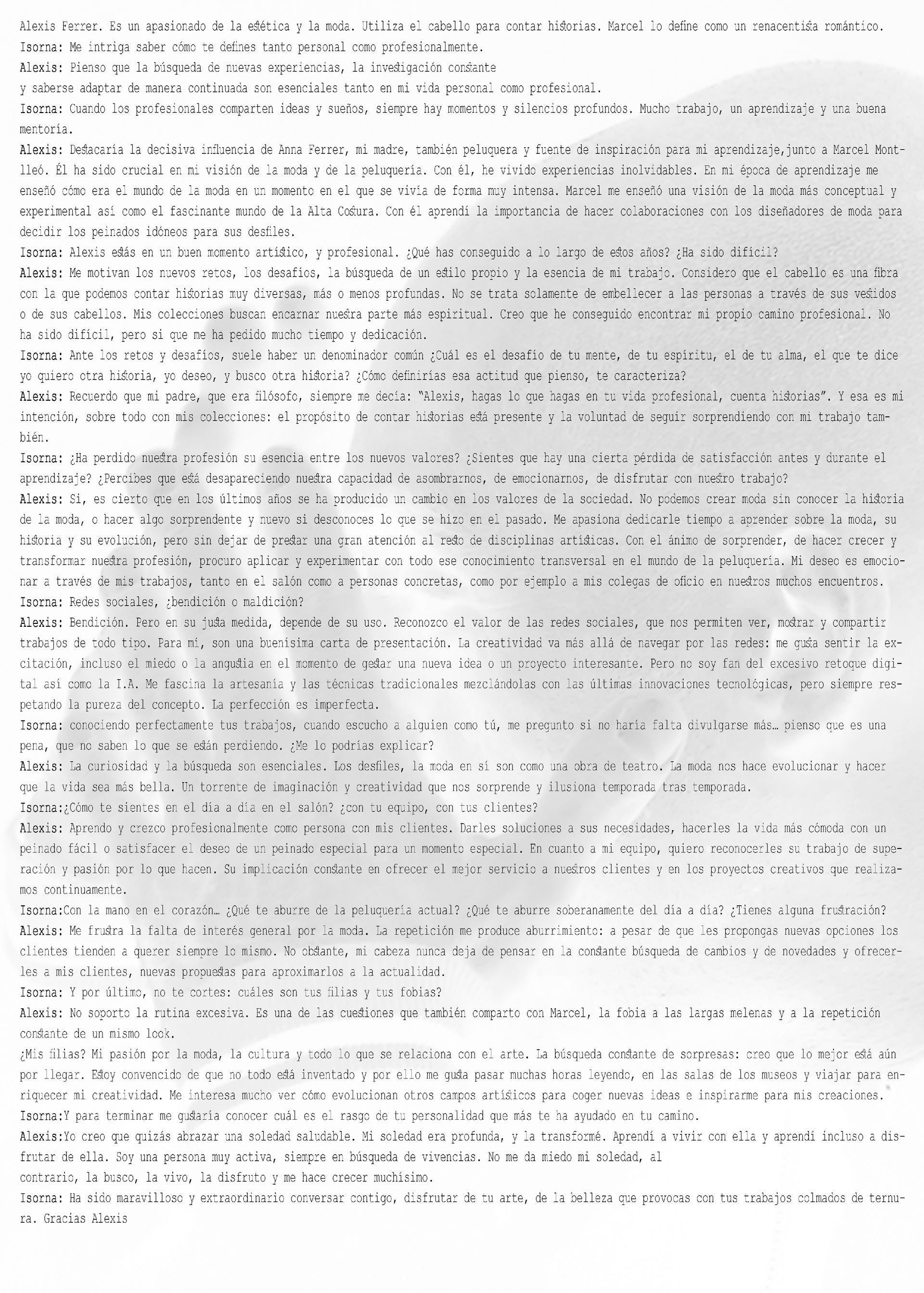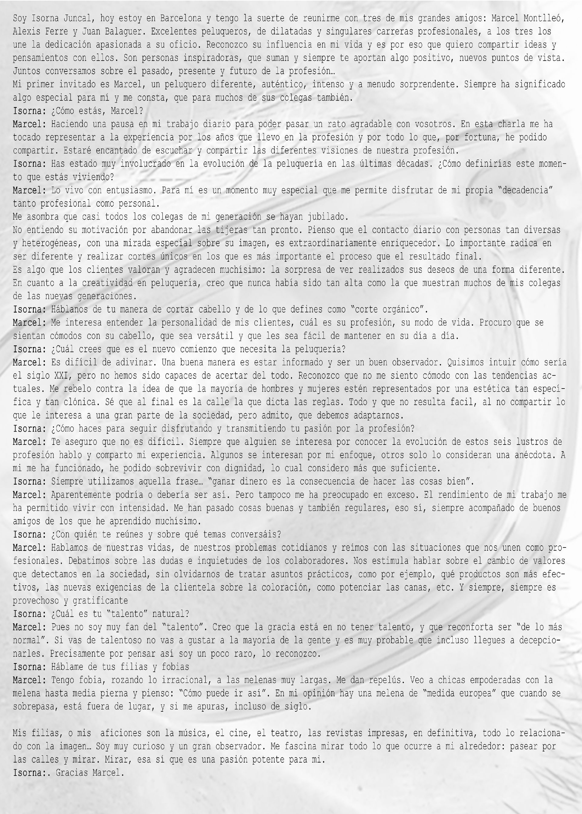La Deconstrucción de un Curriculum No me gusta mirar hacia atrás. Soy de los que se empeñan en disfrutar del presente acariciando el futuro. Por eso me resulta tan díficil explicar en pocas palabras mi camino hasta aquí. No obstante está claro que tengo la obligación de hacerlo, para incentivar a conocerme mejor a través de esta página. Soy peluquero y me gusta serlo. Pero también me apasiona todo aquello que suponga romper moldes que deben existir precisamente para esto, para romperlos. Si pienso en el pasado, con esfuerzo y a contrapelo (nunca mejor dicho) veo a alguien que siempre ha querido saber de todo y que no ha tenido problemas en aprender de quienes tenían, aún sin saberlo, cosas con que informarme y formarme. Me queda aún la humildad para decir que he aprendido de gentes diversas que han sido cruciales en mi trayectoria profesional y que, significativamente, no son peluqueros. Como Carlos Rolando que, en mis inicios, me regaló su manera especial de entender la comunicación; o Joaquin Lorente que consiguió atraparme con sus apasionadas conferencias sobre mercados y sus especiales características; o Pepo Sol, al que añoro tanto, y que despertó en mí el entusiasmo por lo original, lo experimental, lo transgresor, lo arriesgado, o Chu Uroz, que con su peculiar visión del mundo, me indujo a observarlo todo del revés, por debajo, a la inversa... Hay quien cree que lo mejor es la concentración en el propio quehacer, pero yo siempre he intuido, no digo pensado, que la única forma de ser alguien en tu profesión, en tu especialidad, es ser miembro activo del colectivo de los que van por delante, para poder captar, transformar y transmitir esta nueva realidad en tu ámbito. Por eso, además del trabajo diario con mis clientes que nunca he obviado porque constituye la esencia de mi vida, he colaborado en el mundo del cine con J.A. Salgot, Bigas Luna, Ventura Pons, Fernando Colomo, Jordi Cadena, Francesc Bellmunt, Manuel Huerga y Mar Targarona. En teatro con El Tricicle, Dagoll-Dagom, La Cubana, Els Joglars, Carles Santos, La Fura dels Baus, Teatre Lliure y muchas producciones puntuales como por ejemplo con Xavier Albertí ó Lourdes Barba. En fotografía de moda con David Virgili, Manuel Esclusa, Manuel Bertrand, Toni Riera, José Manuel Ferrater, Antoni Bernat y María Espeus. En publicidad con MMLB, Tandem o Group Films. En escuelas de moda, con actuaciones puntuales o ejerciendo de docente como EATM y ESDI. En televisión con El Tricicle o GestMusic. En desfiles de moda, nacionales e internacionales, donde me siento absolutamente integrado y cómodo, con Antonio Miró, Josep Font, Armand Basi, Lydia Delgado, Josep Abril, Vittorio y Luchino, Peter Aedo, Jesús del Pozo, Modesto Lomba, Totón Comella, Guillermina Baeza, Mila y Tucho Balado, Marcel Marongiu, David Valls, Jean Paul Gaultier, Joaquim Verdú, Dolce e Gabanna, Lola Escobar, Esteve Sita-Mur, Joe Cassily, Hellen Story, Sybila, Jordi Cuesta, Angel Schasser, Roger O., Spastor, TCN ... REUS Y BARCELONA Nacer en un lugar determinado es un accidente, como en mi caso en Reus, pero vivir y trabajar, amar y (a veces) odiar una ciudad, es una elección que comporta ventajas y servidumbres, casi las mismas que convivir con una pareja que, obviamente, se ha escogido en un momento dado. Este es mi proceso vital con Barcelona, mi ciudad, que además de permitirme crecer en y por ella, me dió la oportunidad de participar en un evento que, sin duda, ha constituido un antes y un después, los Juegos Olímpicos, Paralímpicos y Special Olimpics del año 1992. En aquel sueño hecho realidad coordiné el equipo de 80 profesionales de peluqueria y maquillaje que aportaron su esfuerzo a que las ceremonias de apertura y clausura fueran un éxito que aun se recuerda y que, en la commemoración de los 10 años y el traspaso al futuro Forum de las Culturas, tuve ocasión de revivir, para poder agradecer la extraña combinación de suerte y trabajo diario que me hace ser un barcelonés y, al mismo tiempo, ciudadano del mundovo